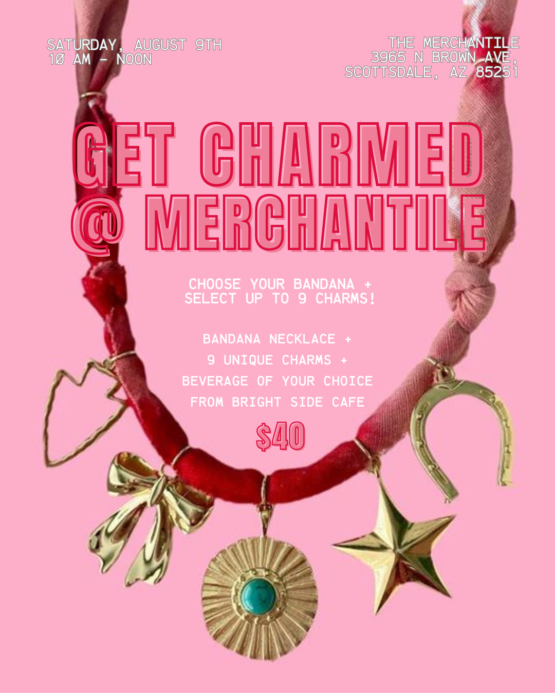 Choose your bandana and select up to 9 charms to customize your own bandana necklace. Each ticket includes a drink from Bright Side Cafe!