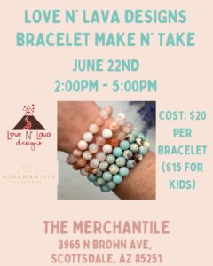 Design your own beaded bracelet with instruction from Love ‘n Lava! $20 per bracelet ($15 for kids). Drop in anytime between 4pm-6pm.