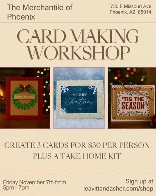 Get ready for the upcoming holiday season by joining us for a card making class with Leavitt & Asher. Learn step by step how to make 3 festive cards plus you will be able to take a kit home with you as well! Price: $30 per person.