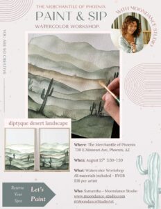 Unleash your creativity in a fun, relaxed setting! Join Moondance Studio for a 2-hour watercolor workshop where you’ll learn new techniques, create your own masterpiece, and enjoy a little sip along the way. No experience necessary—just bring your enthusiasm, favorite drink of choice, and a love for art!