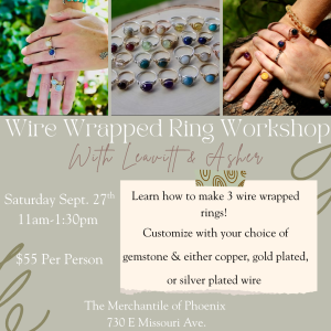 Join us at the Merchantile of Phoenix for a fun hands-on jewelry making experience with Leavitt & Asher. You’ll learn to make 3 wire-wrapped rings with your choice of gemstone & either copper, gold-plated, or silver plated wire. Enjoy your favorite beverage while you unleash your creativity! BYOB. Ticket price: $55 per person.