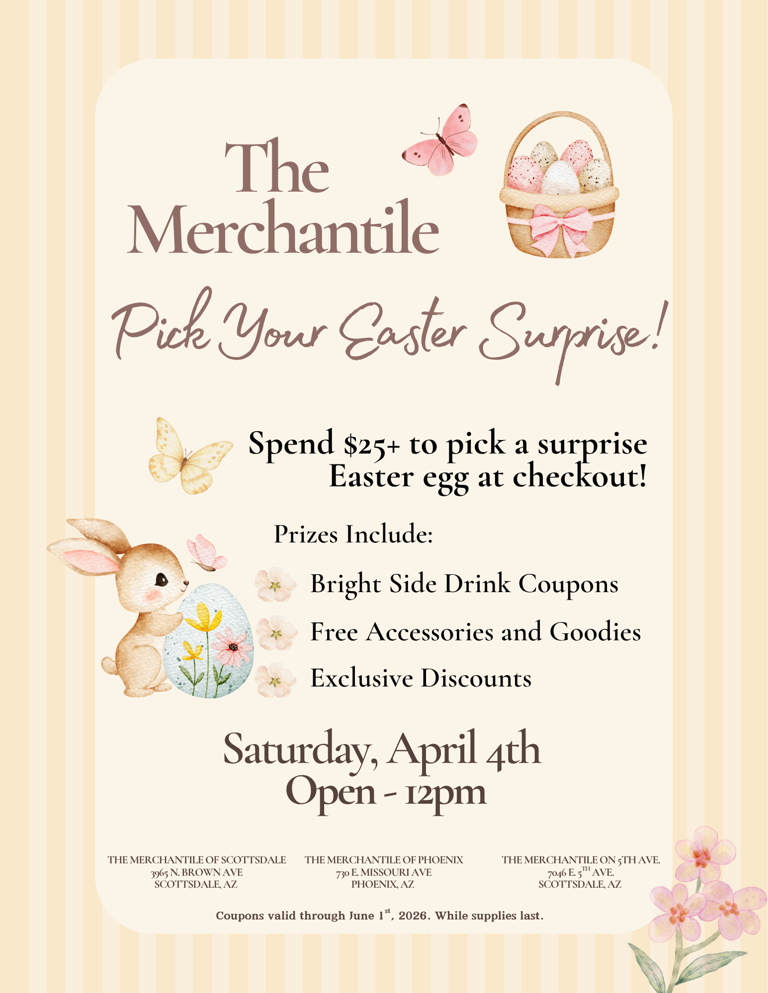 Stop by your favorite Merchantile Location Saturday, April 4th from open until 12pm to pick an easter egg! 🐰 The Details: Spend $25+ at Checkout to pick an Easter Egg! 🎁 Every Egg 🐣has a surprise! 🐥☕🎫 Prizes include Bright Side Cafe drink coupons, exclusive store discounts, free accessories, and more! 📍The Merchantile of Scottsdale...